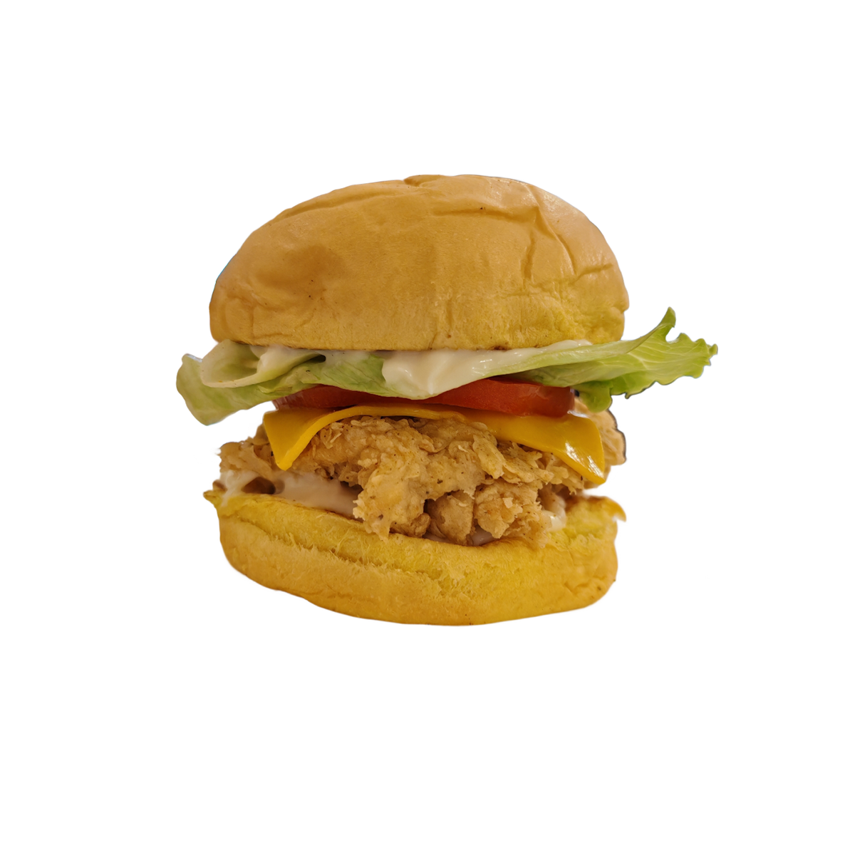 100g breaded frozen Kuwaiti chicken breast with our secret special spices, American cheese slice, iceberg lettuce, tomato, mayonnaise, Potato bun.