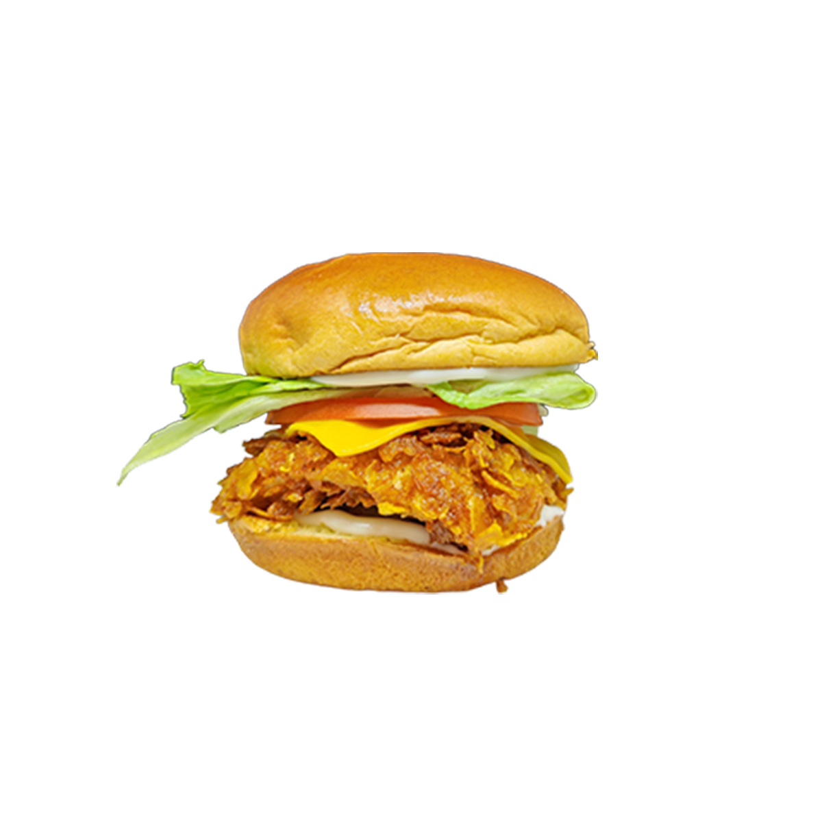 100g cornflake-crusted frozen Kuwaiti chicken breast with our secret special spices, American cheese slice, iceberg lettuce, tomato, mayonnaise, Potato bun.