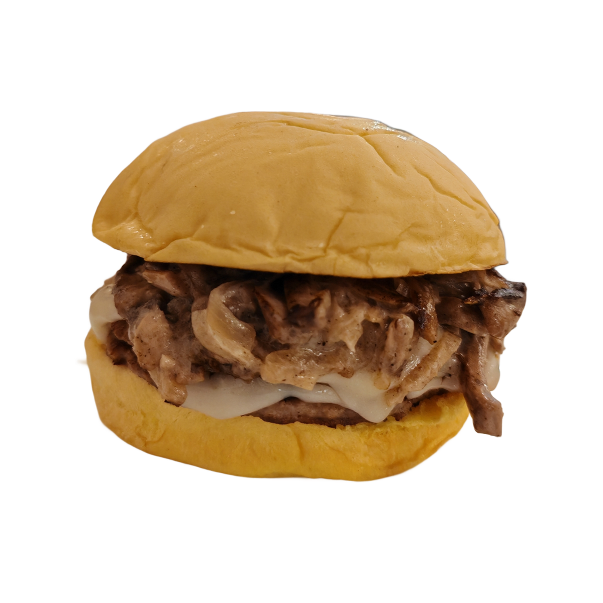 2x50g Kuwaiti veal burger patties, white cheese slice, caramelized onion, fresh mushroom sauce, Potato bun.