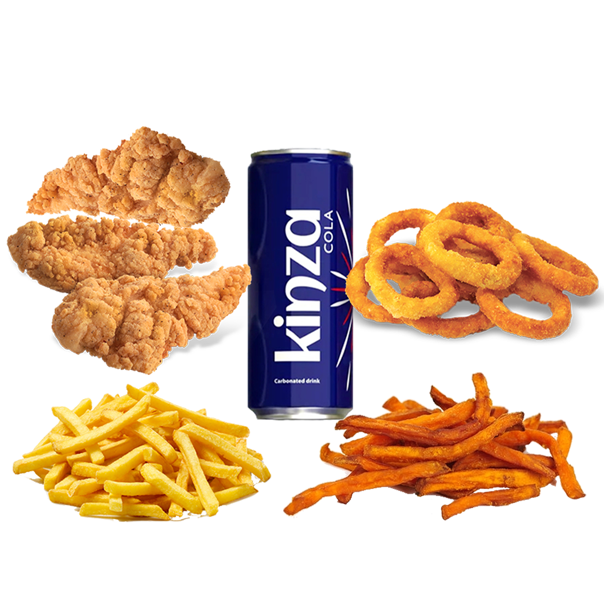3 pieces breaded frozen Kuwaiti chicken breast regular or spicy with our secret special spices, French fries, Sweet Potatoes & Onion Rings, your way — golden fried in sunflower oil or perfectly crisp from the air fryer.